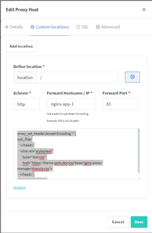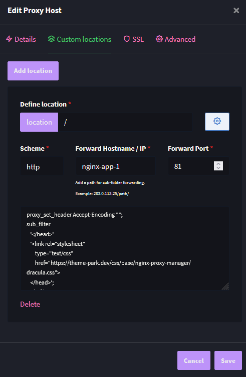 (for the Dracula Theme, other themes can be found here) and we do that by adding a custom Location to our previously Created Nginx Proxy Host: